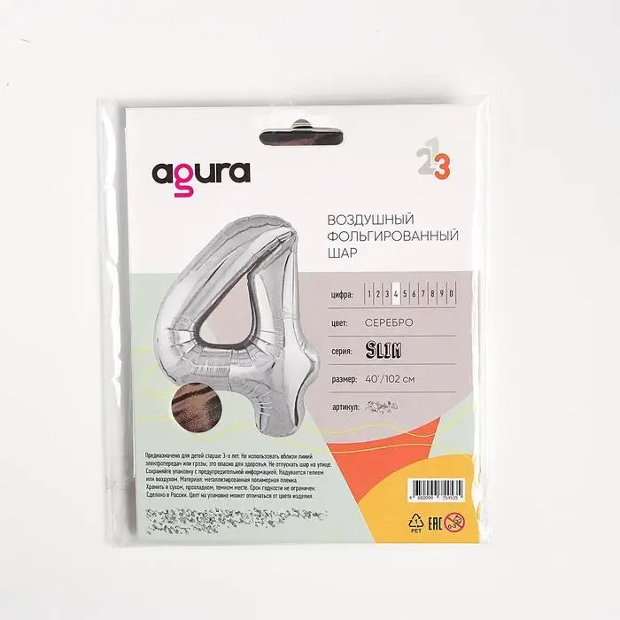Шар фольгированный 40" «Цифра 4», цвет серебряный, Slim