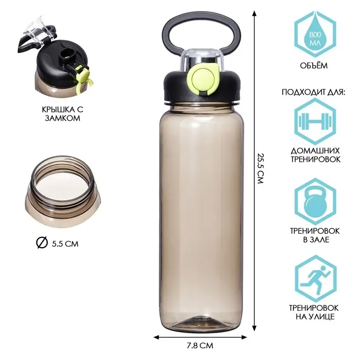 Спортивная бутылка для воды идеально подойдет для всех, кто ведет активный образ жизни. Это стильный аксессуар, который не только позволит вам утолить жажду, но и станет незаменимым атрибутом для занятий спортом, туризма и пеших прогулок. С этой спортивной бутылкой вы всегда будете иметь возможность поддерживать свой организм правильным уровнем водного баланса. Она станет вашим верным спутником как на тренировках, так и в повседневной жизни. Благодаря ее удобной форме и вместительности в 800 мл, она легко помещается в сумке или рюкзаке. Эта бутылочка для воды идеальна для использования в школе и на спортивных занятиях детей и малышей.