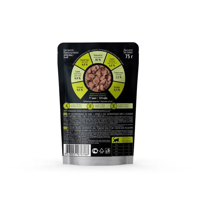 Гарантируемые показатели (на 100 г продукта)*: влажность – 83 %, сырой протеин – 6,0 %, сырой жир – 3,0 %, кальций – 0,5 %, фосфор – 0,3 %, энергетическая ценность – 65 ккал/274 кДж.