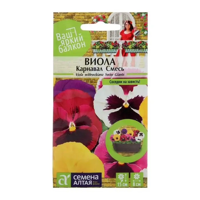 Очаровательная смесь ярких цветков с большим пятном. Смесь отличается ранним цветением и компактной формой куста. Виола, или Анютины глазки, относятся ксамым рано и продолжительно цветущим растениям. Широко используется в ковровых посадках на клумбах и в бордюрах, отлично смотрится в оконных и балконных ящиках, вазонах и кашпо.Неприхотливое, зимостойкое растение, предпочитает открытые солнечные участки, но может расти в полутени. Хорошо развивается на почвах, состоящих из торфа, перегноя и дерновой земли с добавлением песка. При выращивании как двулетника, семена на рассаду высевают в мае-июле на разводочные гряды. В конце августа - начале сентября подросшие сеянцы высаживают на постоянное место. Для получения растений, цветущих в год посева, семена на рассаду высевают с последней декады февраля. В субстрате делают бороздки глубиной 3-5 мм, интервал между бороздками - 1 см. Семена раскладывают с интервалом 2 см и присыпают почвой. Посевы увлажняют, накрывают стеклом и помещают в тёплое светлое место с температурой +20-25оС. Стекло периодически снимают для проветривания. Всходы появляются через 7-10 дней. В первые дни проводят проветривания 2 раза в сутки по 20-30 минут, постепенно увеличивая временной интервал, полностью укрытие снимают через неделю. При образовании двух настоящих листиков проводят пикировку. В открытый грунт рассаду высаживают в конце мая - июне. Посадочный интервал 15-20 см. Цветение при выращивании рассадой с июля до заморозков, при посеве семян в грунт – на следующий год с ранней весны и до поздней осени.
