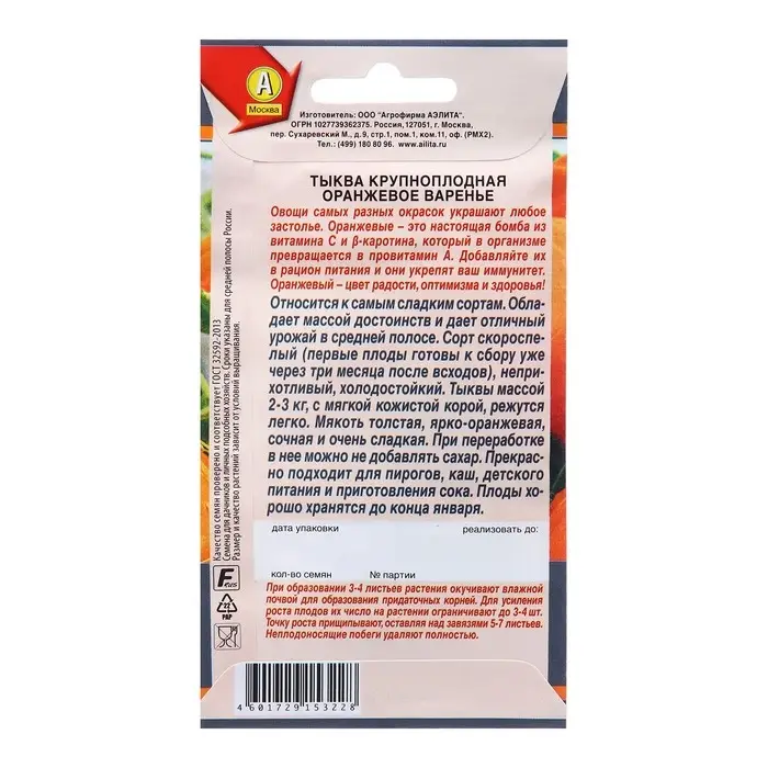 Семена Тыква крупноплодная Оранжевое варенье Галерея оранжевых овощей Ц/П 2г