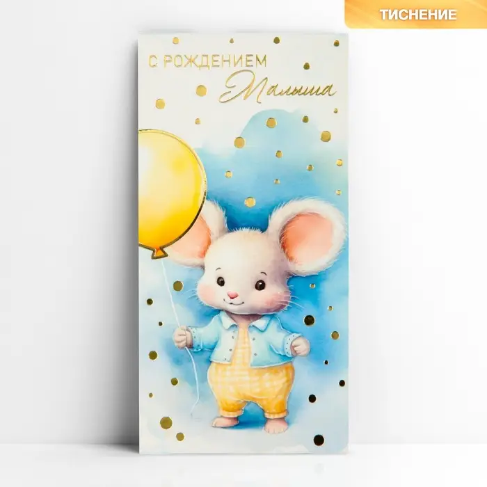 Конверт для денег «С рождением малыша», мышонок, тиснение, 16.5 х 8 см