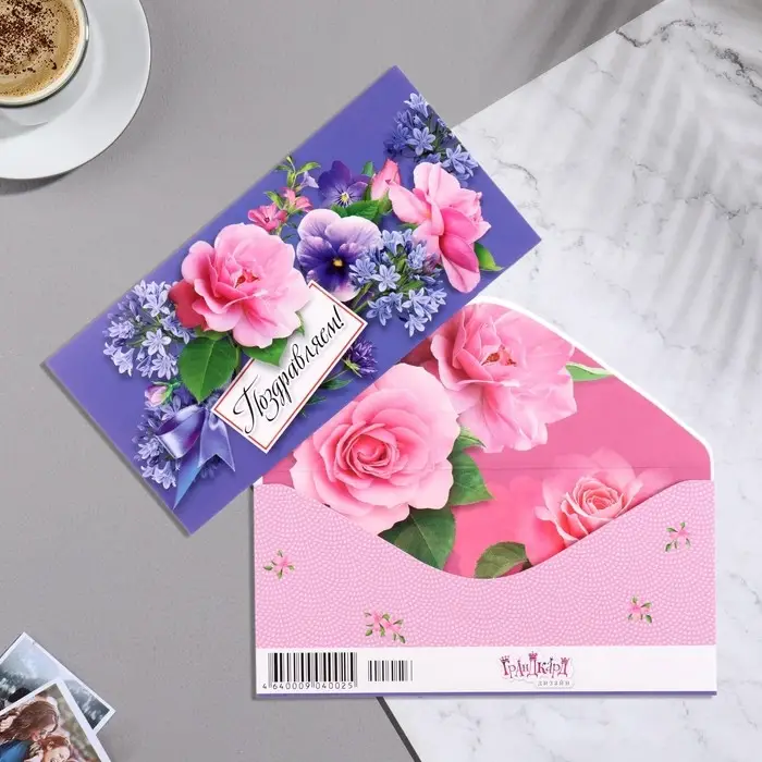 Конверт для денег "Поздравляем!" фиалка, 8,3х16,7 см