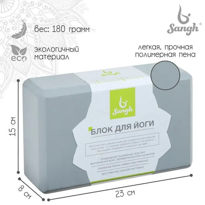 Блок для йоги Sangh, 23х15х8 см, цвет серый