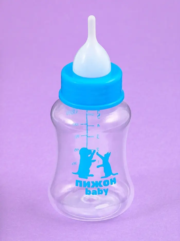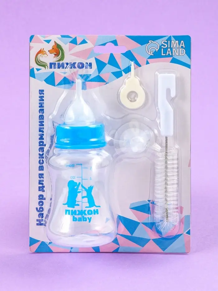 Набор для вскармливания щенков, котят и грызунов ПИЖОН. Набор для вскармливания применяют для искусственного вскармливания новорожденных и подрастающих щенков, котят и других животных, а также для кормления больных и выздоравливающих животных. Способ применения: кончик резиновой соски проткните иглой или отрежьте верхушку ножницами. Будьте осторожны, потому что из-за слишком большого отверстия в соске животное может подавиться. После каждого использования, тщательно помойте бутылочку и соску.