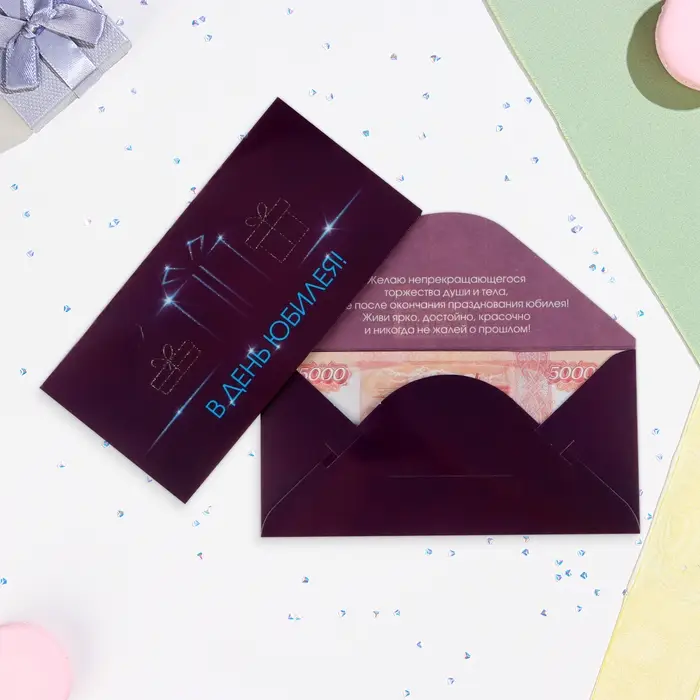 Конверт для денег "В День Юбилея!" глиттер, фиолетовый фон, 8х17 см