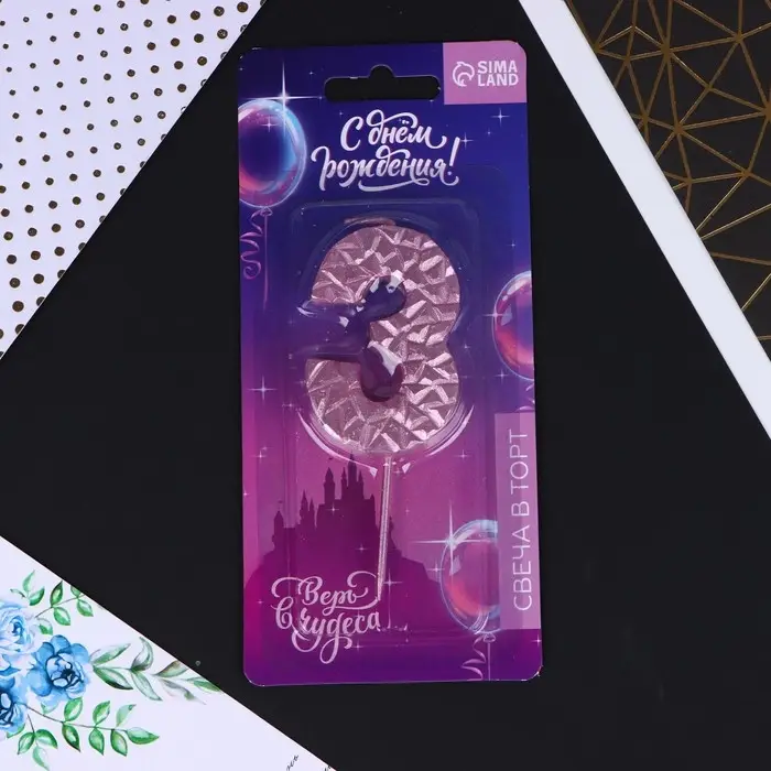 Свеча для торта, цифра «3», розовая, 10 х 4 см