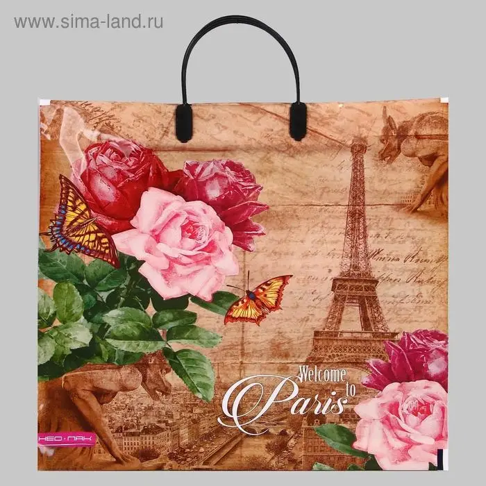 Пакет "Париж с розами", полиэтиленовый с пластиковой ручкой, 37х35 см, 90 мкм