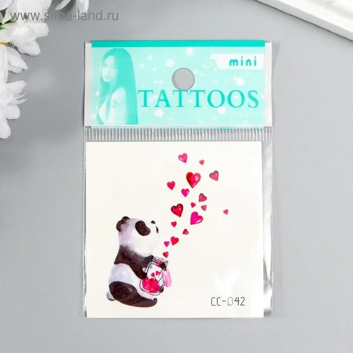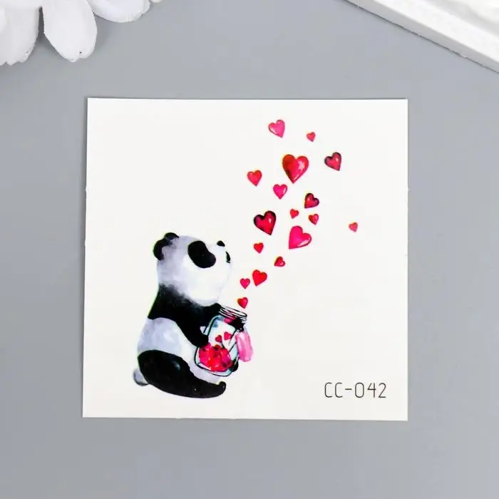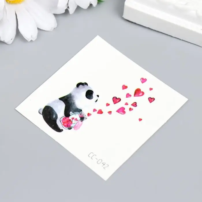 Татуировка на тело цветная "Панда с баночкой с сердцами" 6х6 см