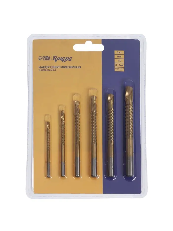 Набор сверл фрезерных универсальных ТУНДРА, HSS, TiN, цилиндр. хвостовик, 3 - 8 мм, 6 шт.