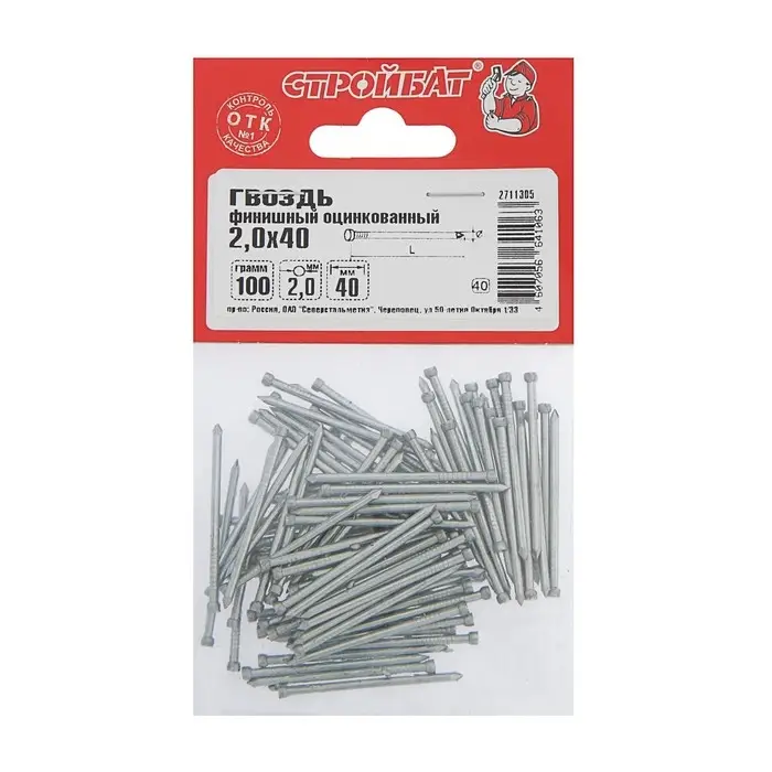 Гвозди СТРОЙБАТ, финишные, ГОСТ 7811-7035, оцинкованные, 2x40 мм, 0,1 кг