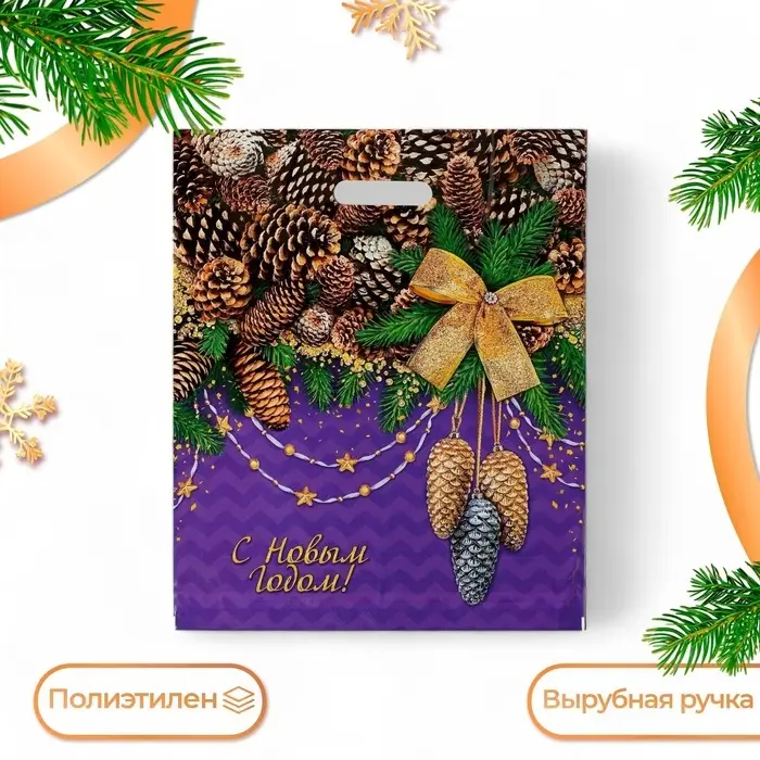 Пакет "Блестящие шишки", полиэтиленовый с вырубной ручкой, 38х47 см.