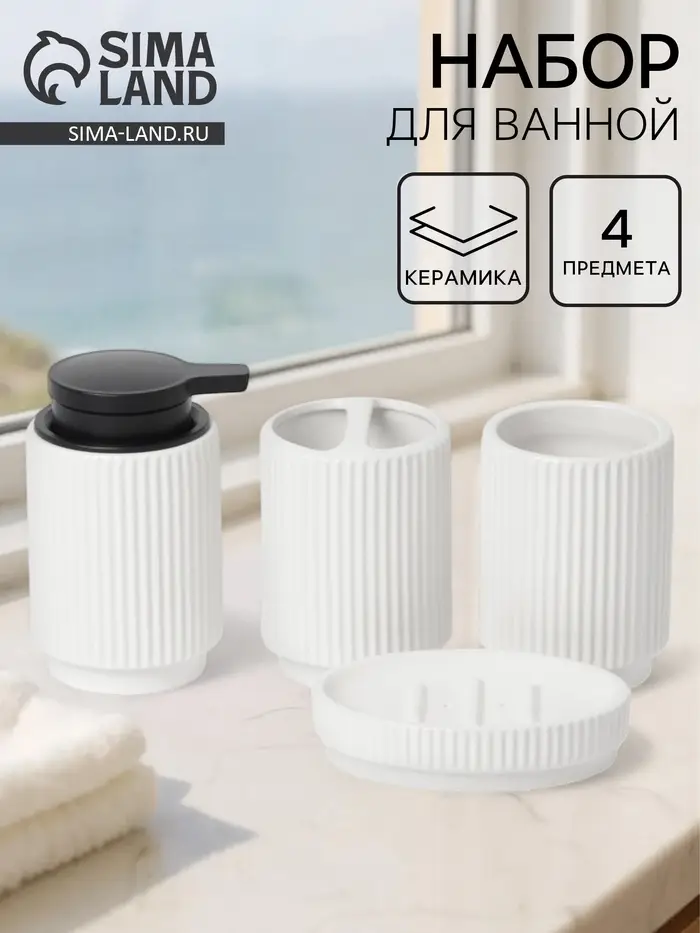 Набор аксессуаров для ванной комнаты SAVANNA Monro, 4 предмета (мыльница, дозатор для мыла 450 мл, стакан, баночка), цвет белый