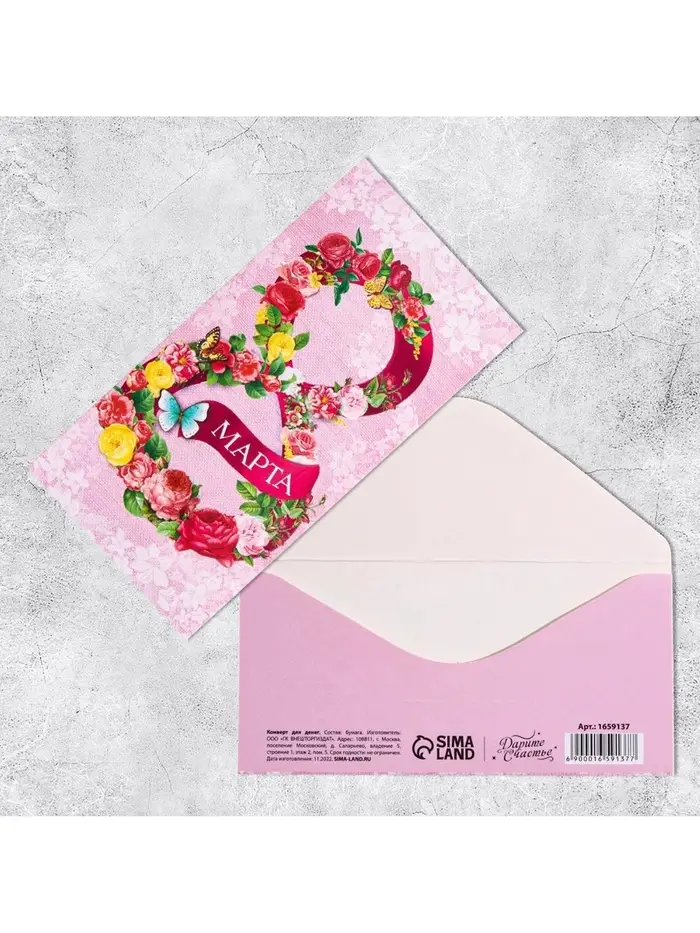 Конверт для денег «С 8 Марта», цветочная цифра на розовом, 16.5 х 8 см