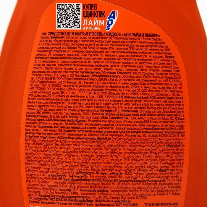 Средство для мытья посуды Aos "Лайм и имбирь", 450 мл