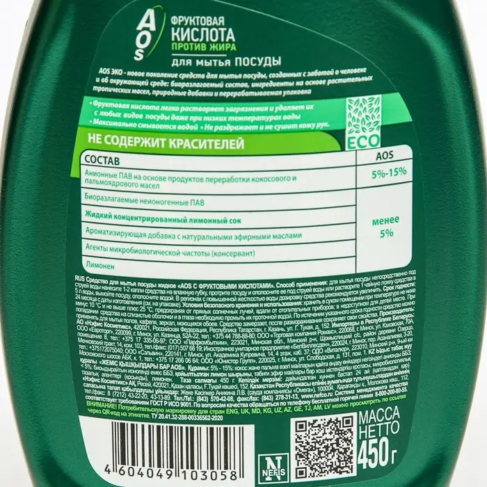 Средство для мытья посуды Aos Фруктовыми кислотами 450 г