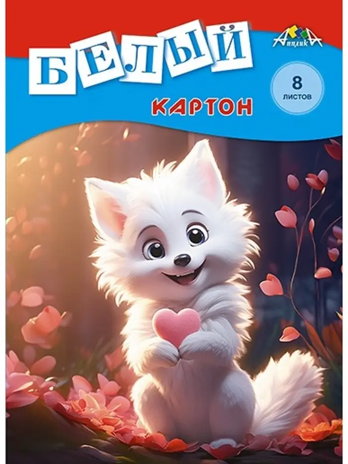 Картон белый А4, 8 листов "Белый лисёнок", немелованный, 200 г,м2, в папке
