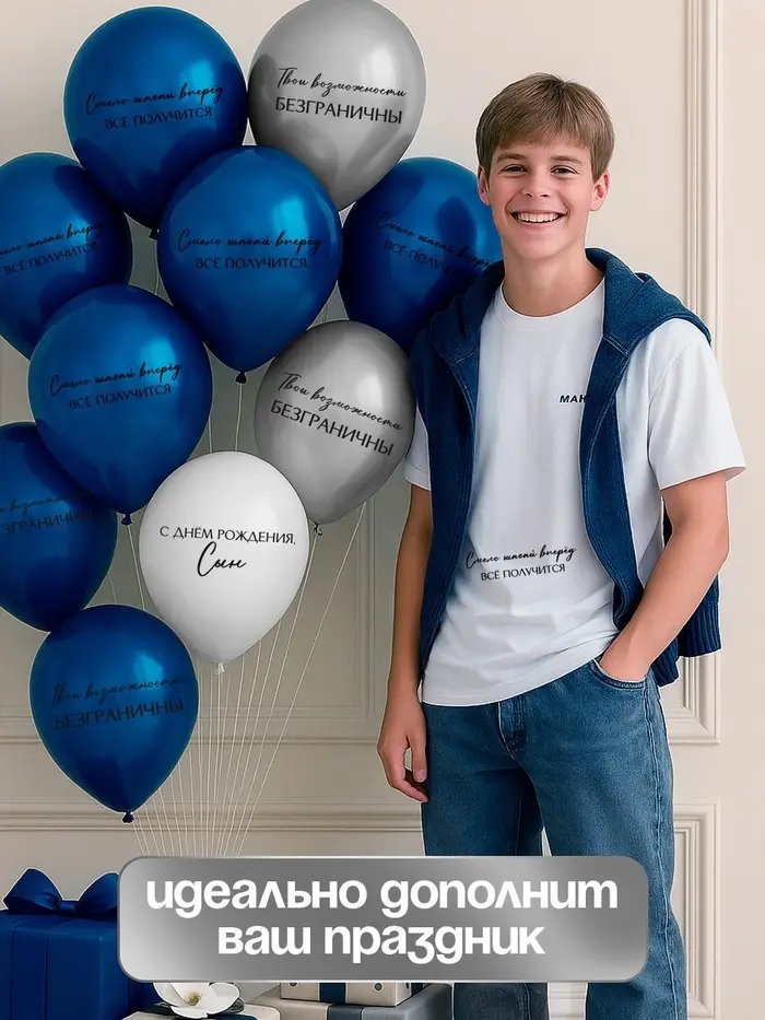 Воздушный шар латексный 12" «С днём рождения, сын. Всё получится», синий хром, серебро хром, белый 5