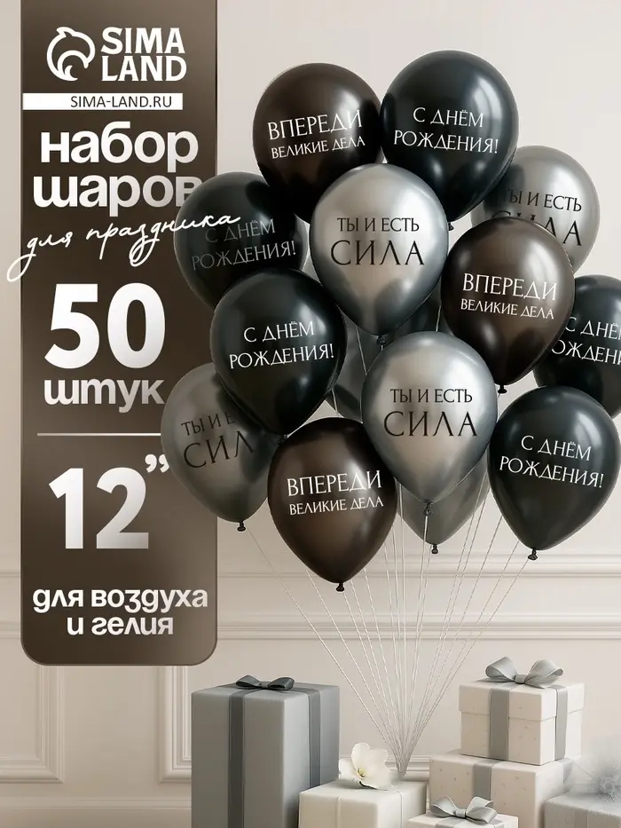 Воздушный шар латексный 12" «С днём рождения. Ты- сила », серебро хром, графит хром, чёрный 50 шт. 1