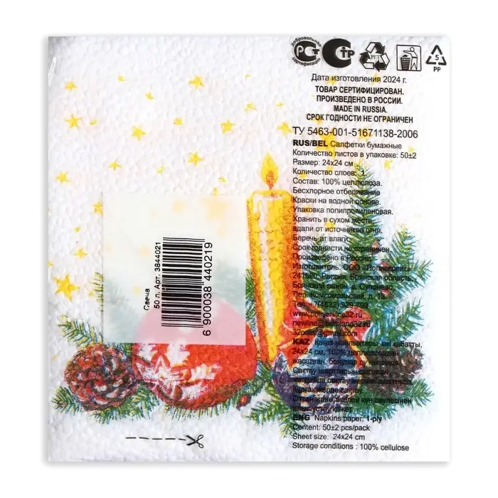 Состав 100% целлюлоза. Размер салфетки в развёрнутом виде 24х24 см. в сложенном виде 12х12 см.
