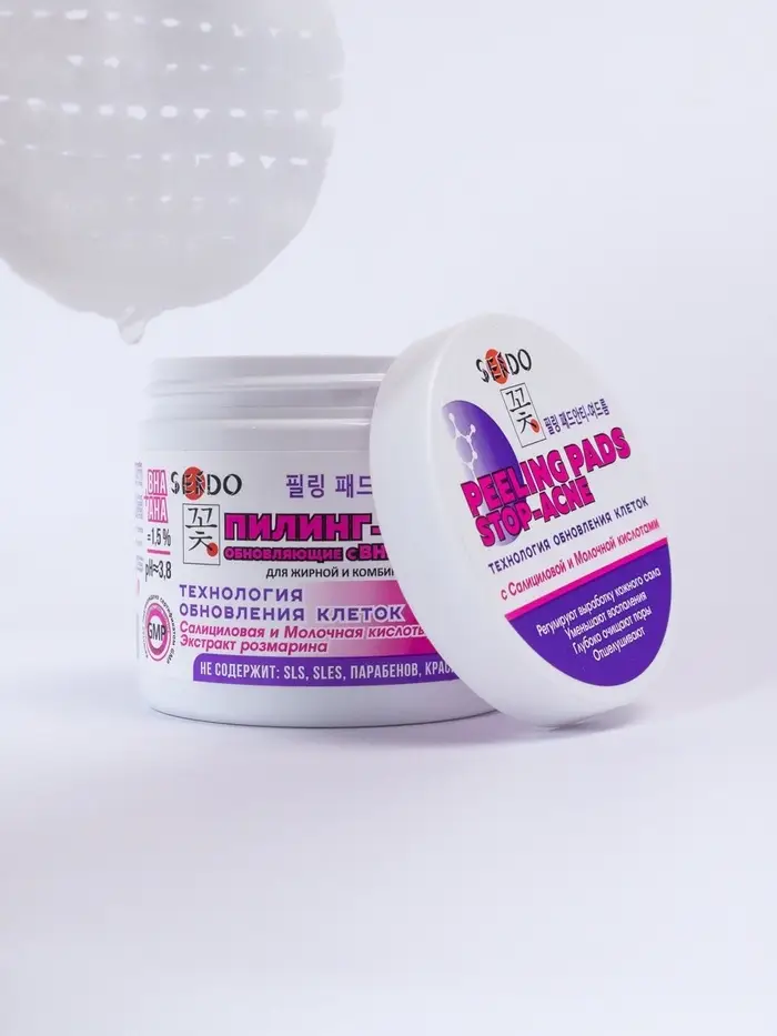 Эффективная альтернатива скрабам — пилинг-пэды с BHA-кислотой, которые деликатно очищают кожу без механического повреждения. Благодаря салициловой кислоте, средство проникает в поры, растворяет загрязнения и чёрные точки, регулирует выработку себума и выравнивает текстуру кожи.