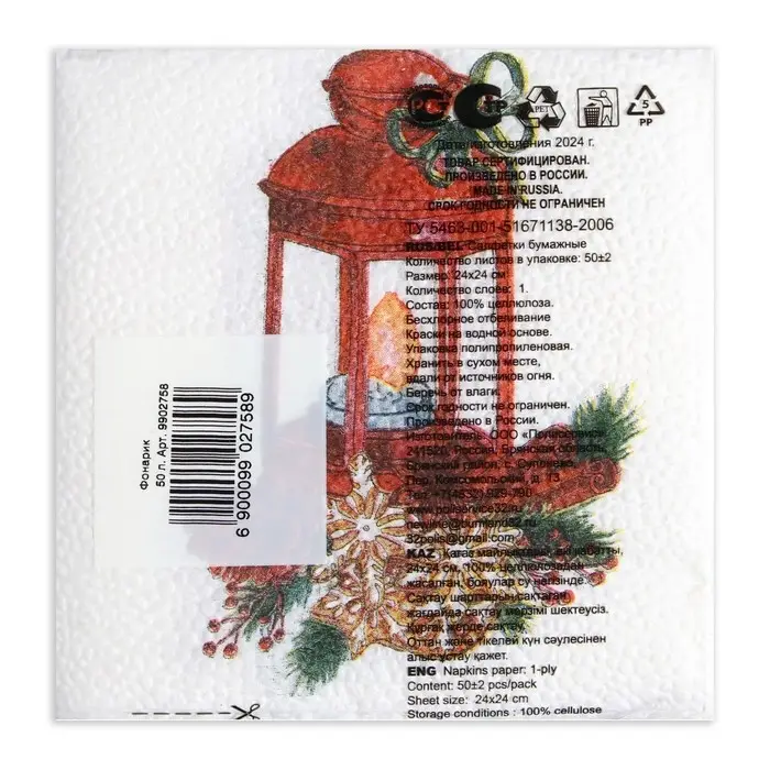 Состав 100% целлюлоза. Размер салфетки в развёрнутом виде 24х24 см. в сложенном виде 12х12 см.
