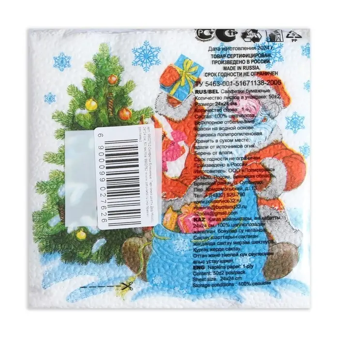 Состав 100% целлюлоза. Размер салфетки в развёрнутом виде 24х24 см. в сложенном виде 12х12 см.