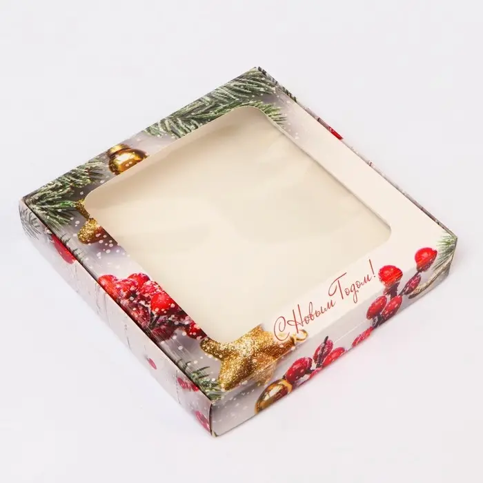 Коробка изготовлена из прочного картона, а прозрачное окно на крышке позволяет эффектно продемонстрировать содержимое, сохраняя его свежесть и целостность. Яркий новогодний дизайн, включающий снежинки, елочные украшения и рождественские элементы, создаёт атмосферу праздника и волшебства.