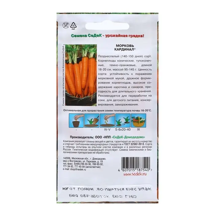 Позднеспелый (140-150 дней) сорт. Корнеплоды конические, тупоконечные, темно-оранжевые, длиной 18-20 см, массой 95-145 г.