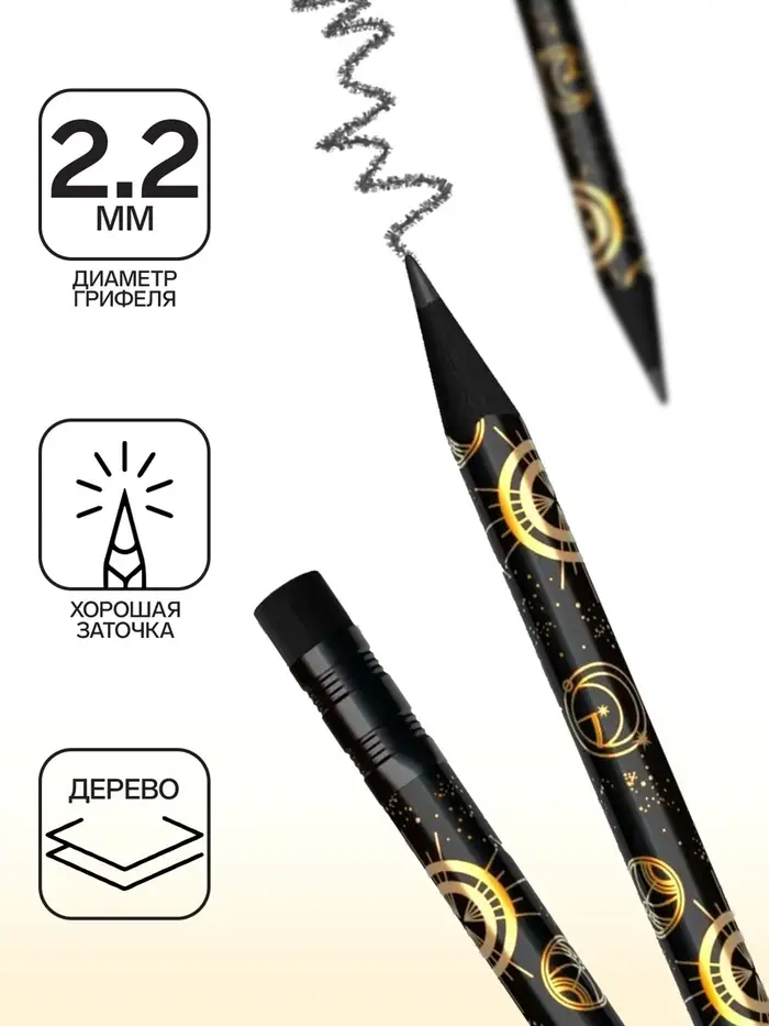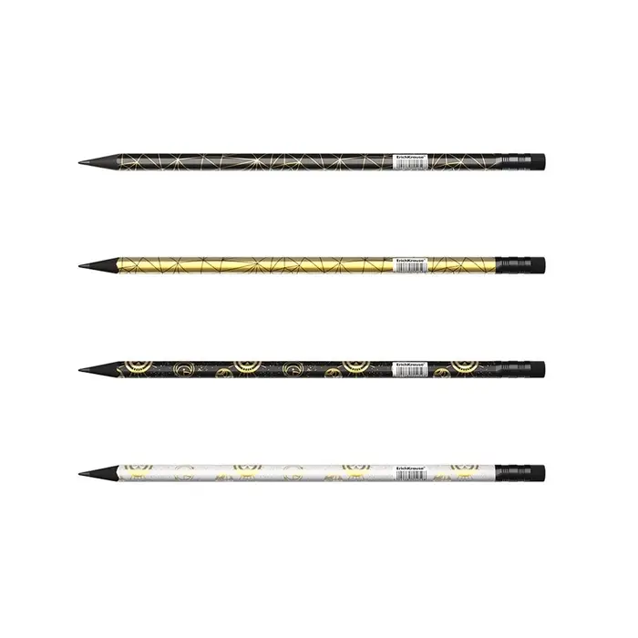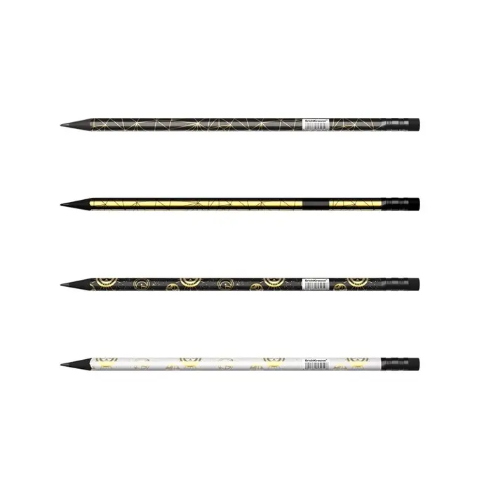- Четыре дизайна корпуса карандаша с фольгированными элементами, черное дерево, ластик черного цвета.