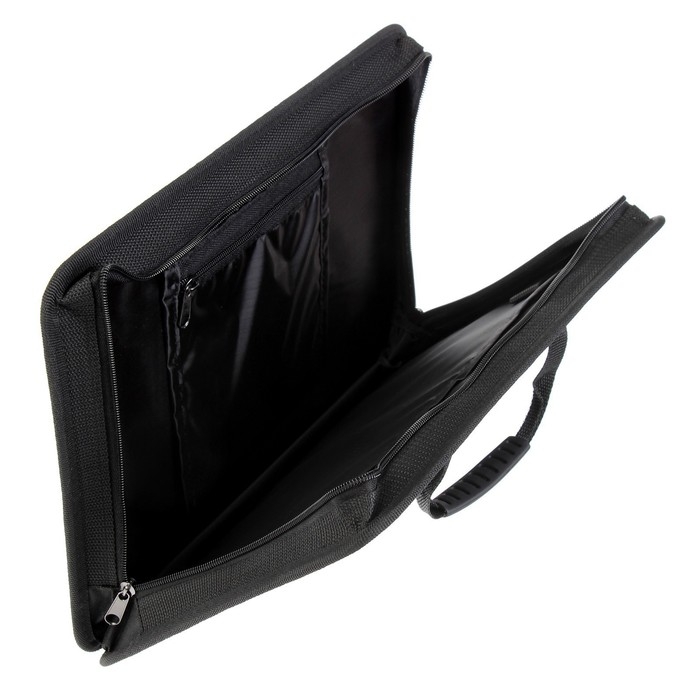 Портфель ЛугаА4 формат, размер 365*260Изготовлен из ткани черного цвета 1 - отделениеВнутри 1 карман, плюс 1 карман на молнии, петля для крепления ручки.Ручки изготовлены из тесьмы с прорезиненным элементом , надежно закреплены поперечной планкой.Закрывается на молнию, расположенной с трех сторон.На молнии для удобства открытия, расположено два замка.