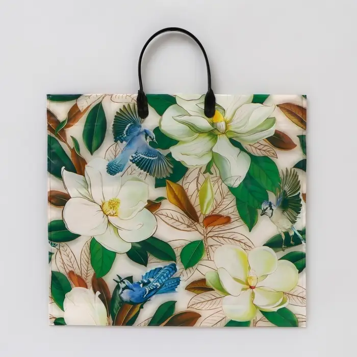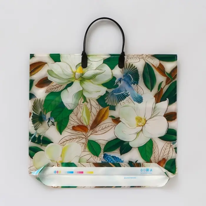 Пакет полиэтиленовый с пластиковой ручкой, благодаря ручкам пакет служит дольше. Прочный и надежный с оригинальным рисунком.
