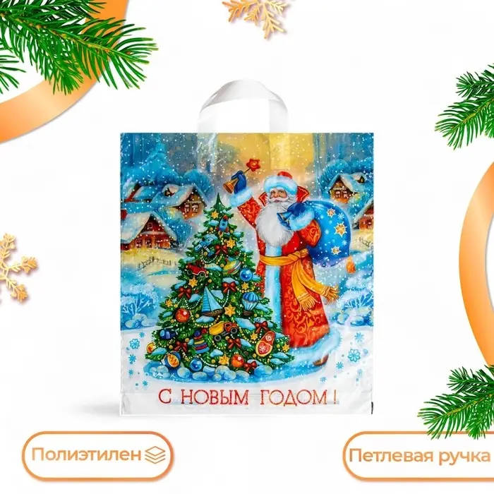 Пакет полиэтиленовый с петлевой ручкой, прочный с оригинальным рисунком.