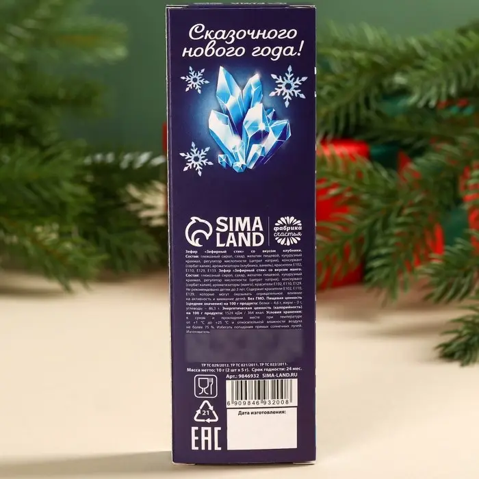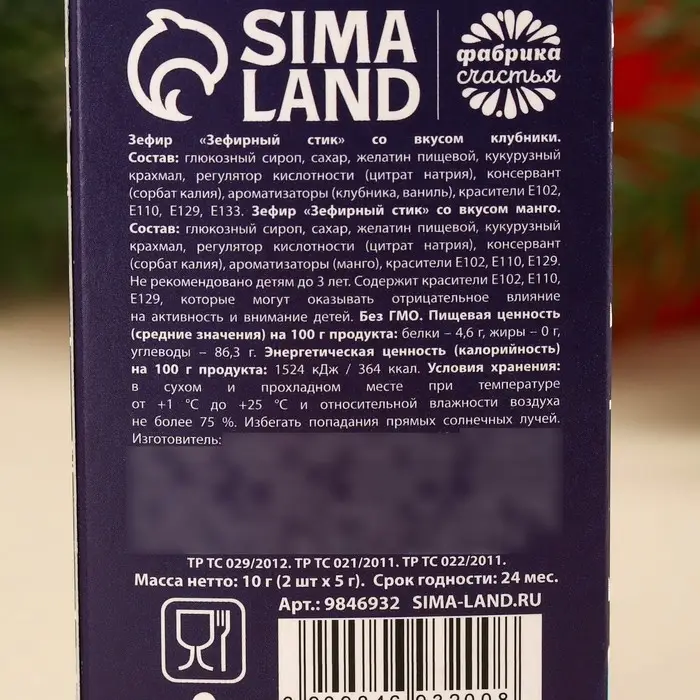 Состав: глюкозный сироп, сахар, желатин пищевой, кукурузный крахмал, регулятор кислотности (цитрат натрия), консервант (сорбат калия), ароматизаторы (клубника, ваниль), красители E102, Е110, Е129, E133.