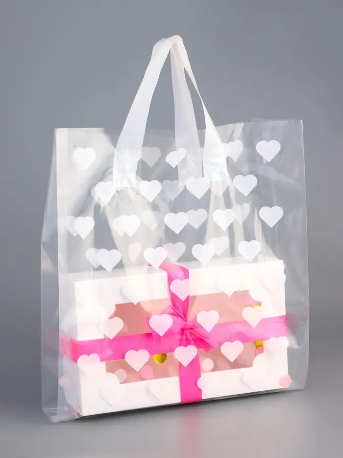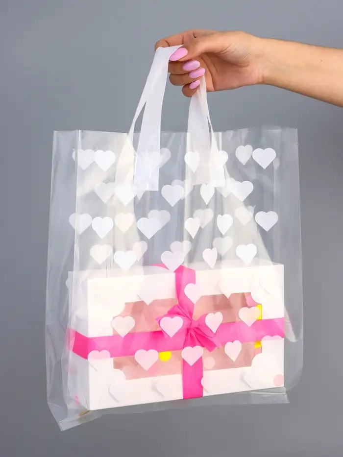 Прозрачный пакет с боковой складкой и петлевой ручкой станет удобным и стильным решением для упаковки подарков на праздники. Его универсальный дизайн с тематическим принтом «Сердечки» подойдёт для Дня святого Валентина, 8 Марта, Дня рождения или любого другого торжества. Пакет легко выдержит вес до 3 кг, а его вместительный размер позволяет упаковать даже крупные подарки.