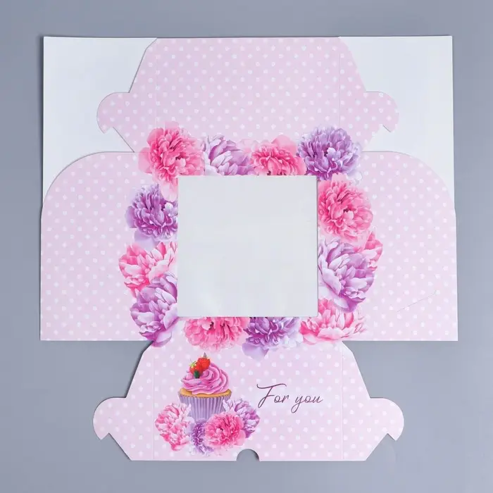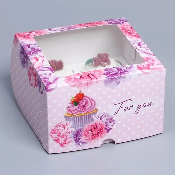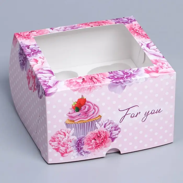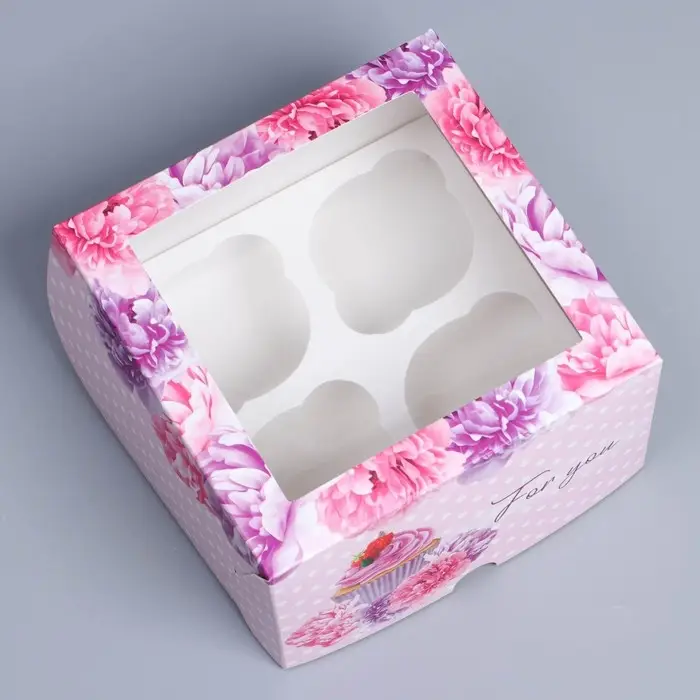 Коробка для капкейков, кондитерская упаковка с окном, 4 ячейки «Пионы», 16 х 16 х 10 см