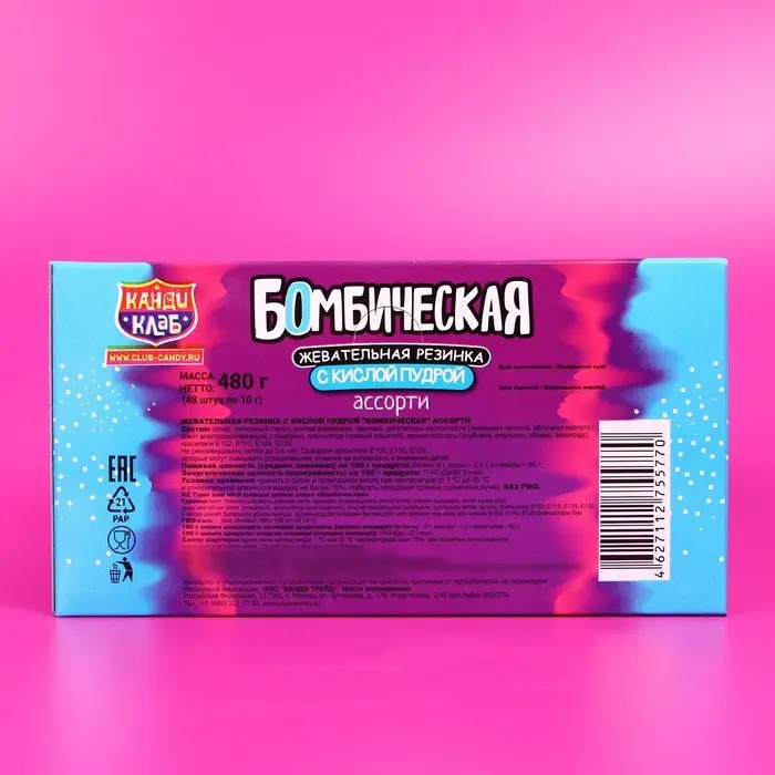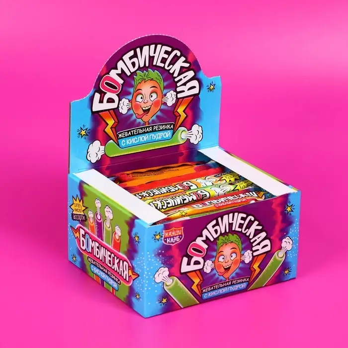 Жевательная резинка с кислой пудрой «Бомбическая» ассорти – идеальный выбор для людей, которые любят приключения и хотят добавить немного кислости в свою повседневность. Наслаждайтесь взрывными вкусами и яркими ощущениями.