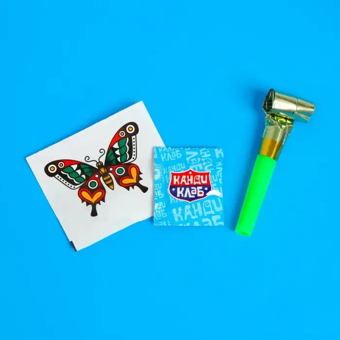 Взрывная карамель с переводной татуировкой и свистком - это уникальное и захватывающее лакомство, которое сочетает в себе вкус и развлечение.