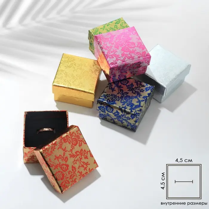 С нашими прекрасными коробочками любой подарок станет еще лучше и ярче. Футляр выполнен из прочного плотного картона. Оптимальный размер коробки 5*5см позволяет разместить кольцо. Внутри каждой коробочки с крышкой есть чёрная бархатная подложка. С помощью специальных прорезей на подушечке можно аккуратно разместить и зафиксировать украшение. А если убрать подложку, упаковка подойдет даже для часов с мягким плоским ремешком или на цепи.
