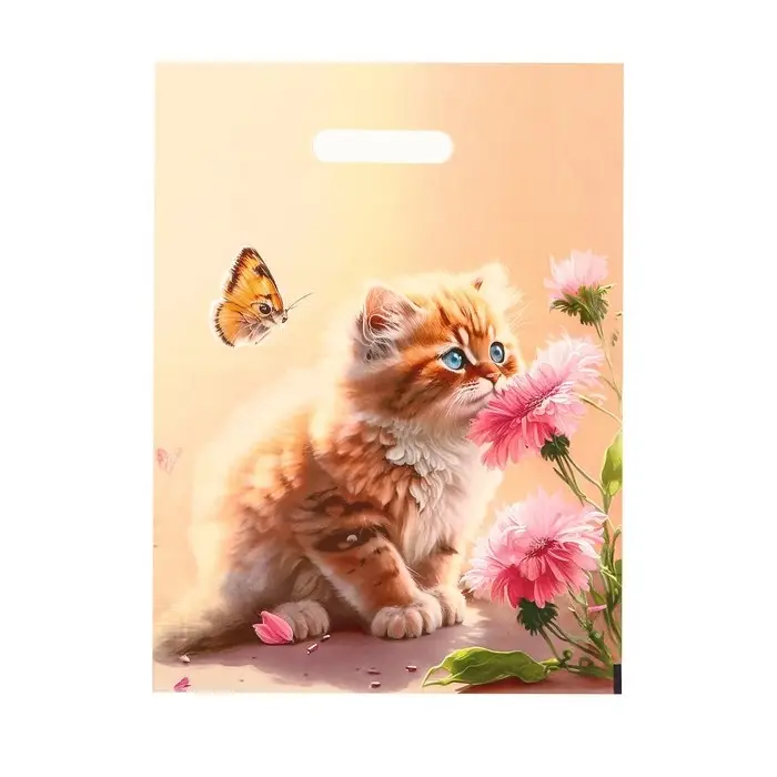 Пакет полиэтиленовый с вырубной ручкой «Котёнок с цветами», 30×40 см, 50 мкм