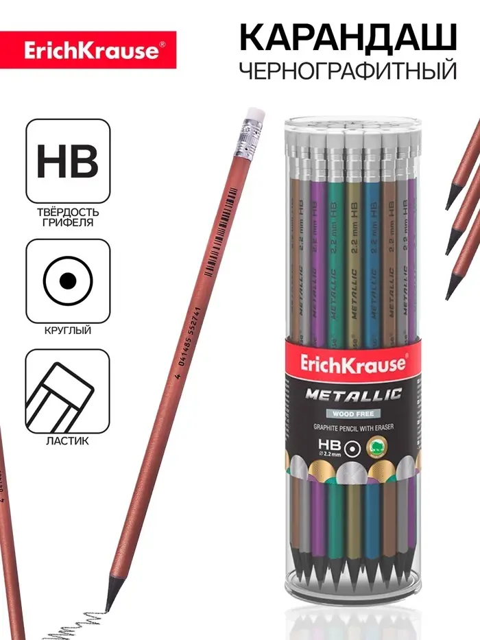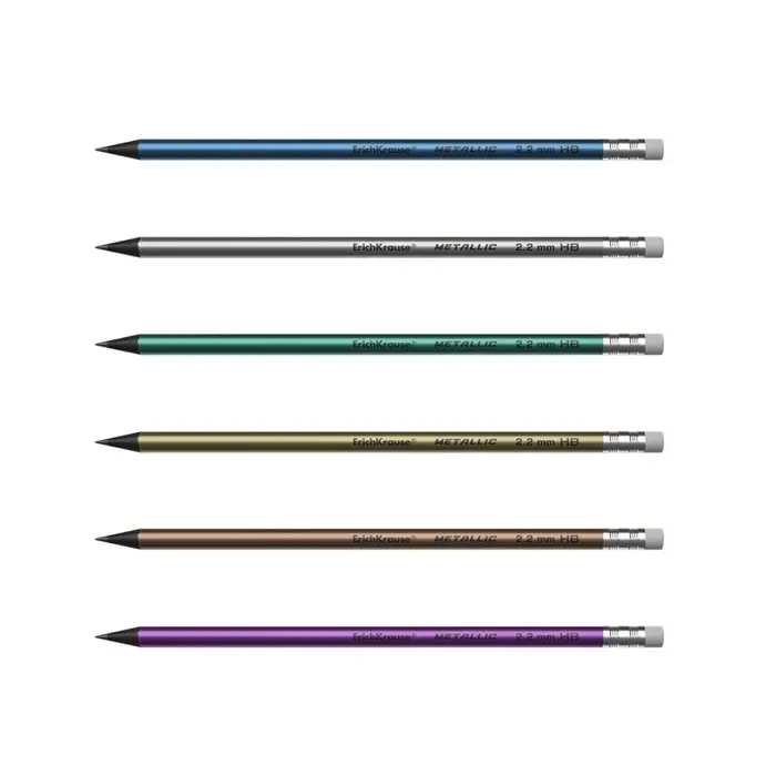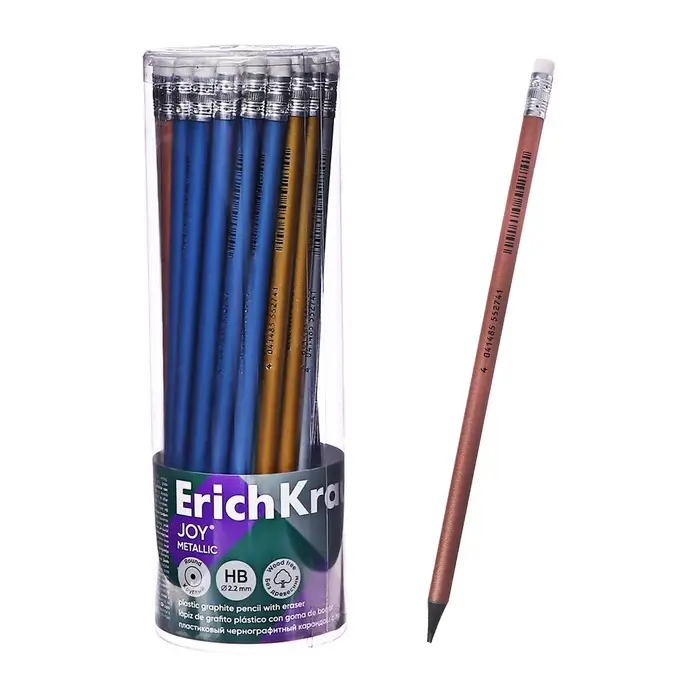 Карандаш чернографитный с ластиком ErichKrause «Metallic», HB, грифель d=2.2 мм, пластик, круглый в тубусе, металлик МИКС