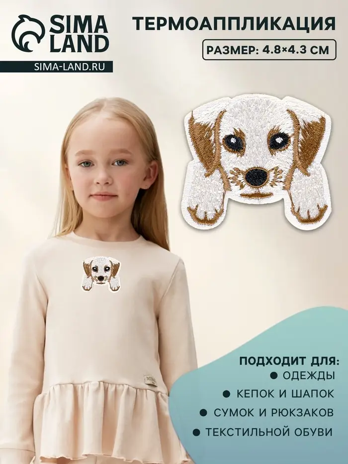 Термоаппликация в виде собачки с лапками — это милый акцент для детской одежды и аксессуаров. Бежево-белый окрас делает изображение мягким и добрым, а компактный размер позволяет использовать его как на футболках, так и на рюкзаках или сумочках. Это не просто украшение — такой элемент помогает создать эмоциональную связь с персонажем, делая вещь более личной.