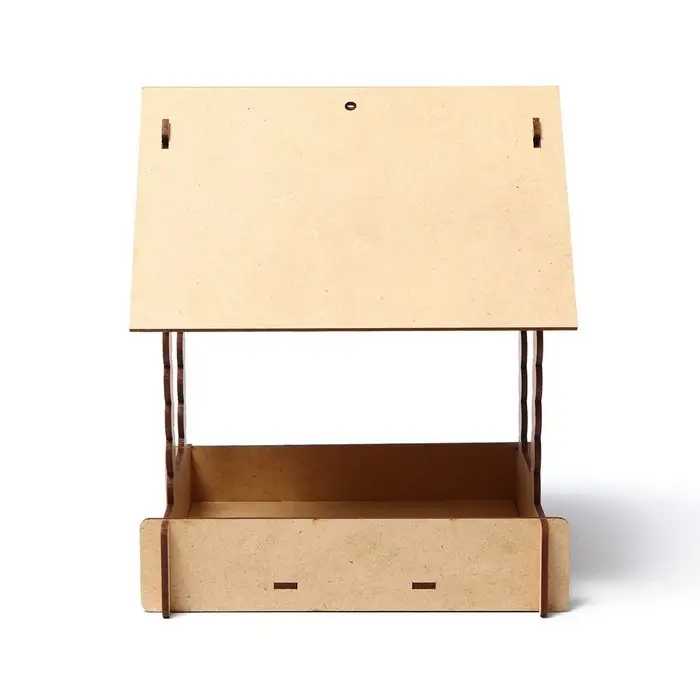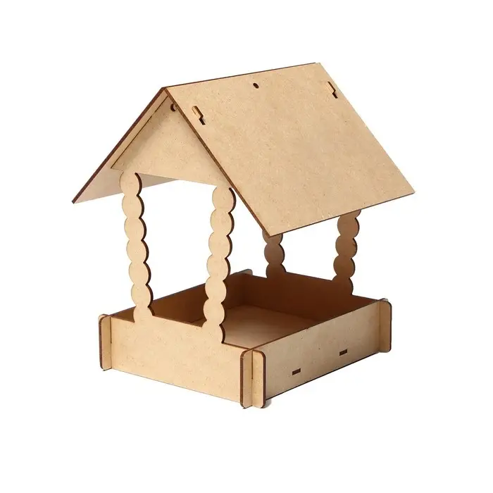 Чтобы собрать кормушку, аккуратно соедините фанерные детали, вставляя их в пазы. Используйте клей для лучшей фиксации. При желании модель можно раскрасить или задекорировать.
