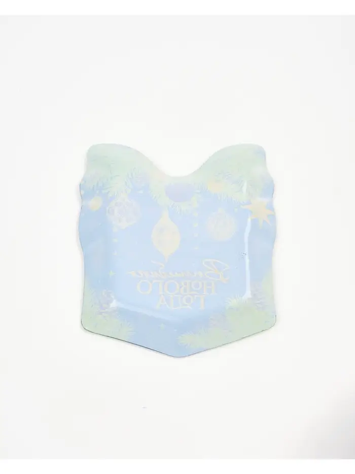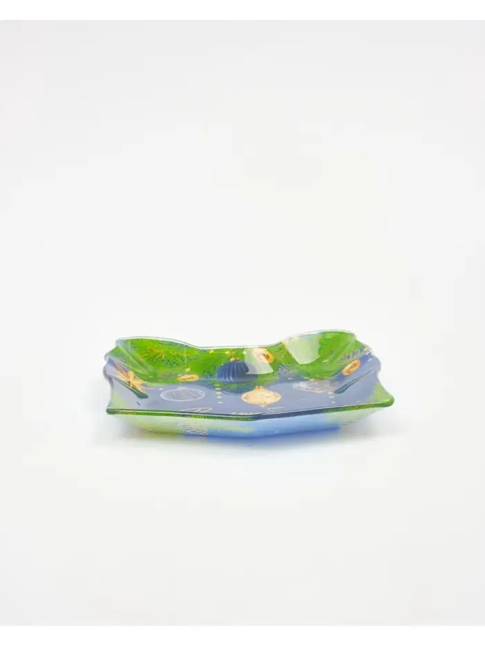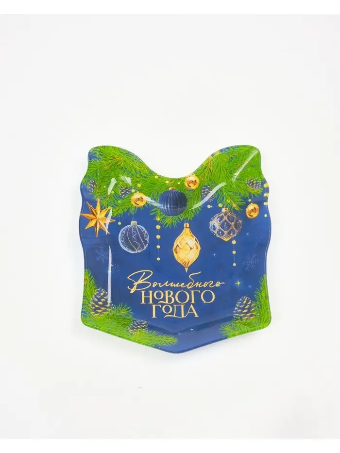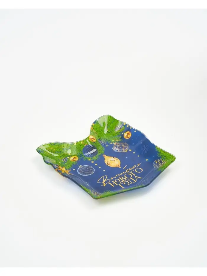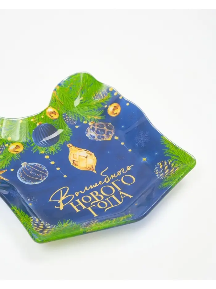 Новогодняя стеклянная тарелка в форме подарка — идеальный выбор для сервировки стола.