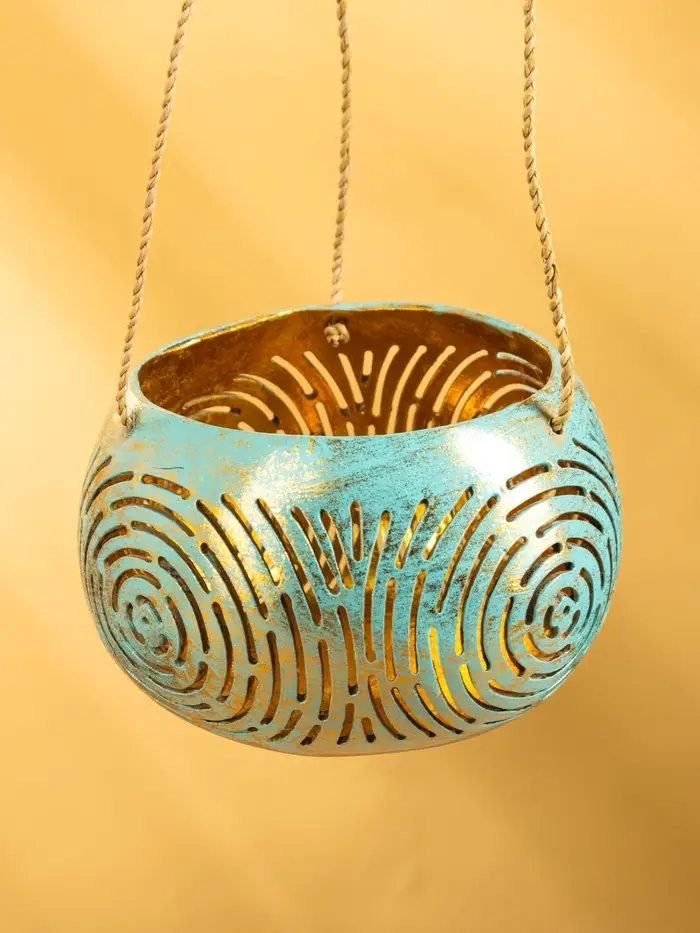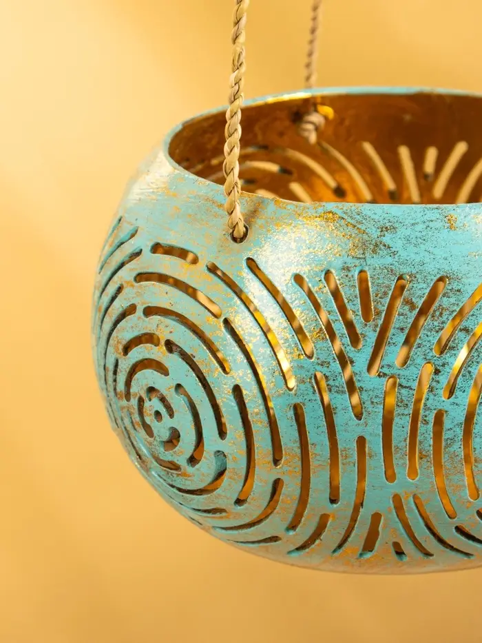 Подсвечник подвесной из кокоса, 14×14×10 см, бирюзово-золотой