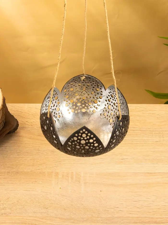 Подсвечник подвесной из кокоса «Бутон», 14×14×10 см, чёрно-серебристый