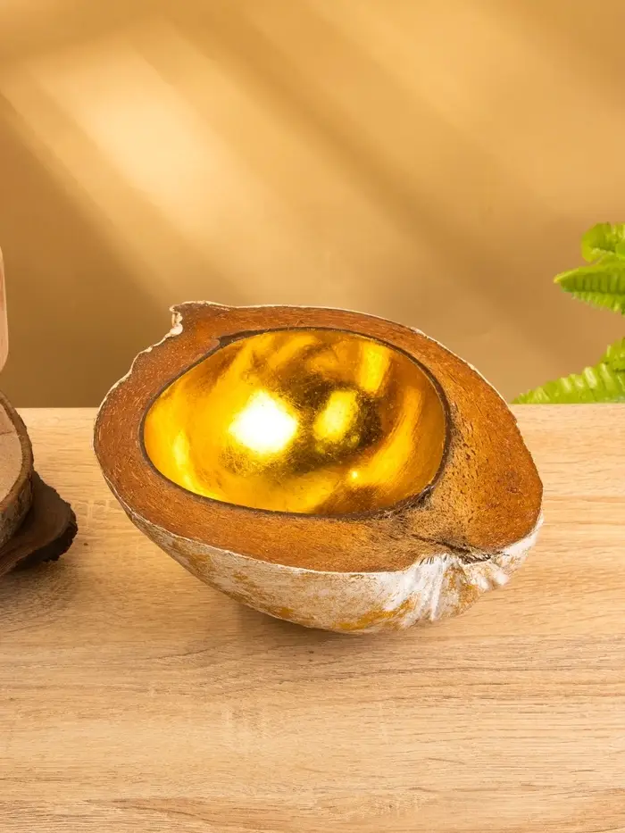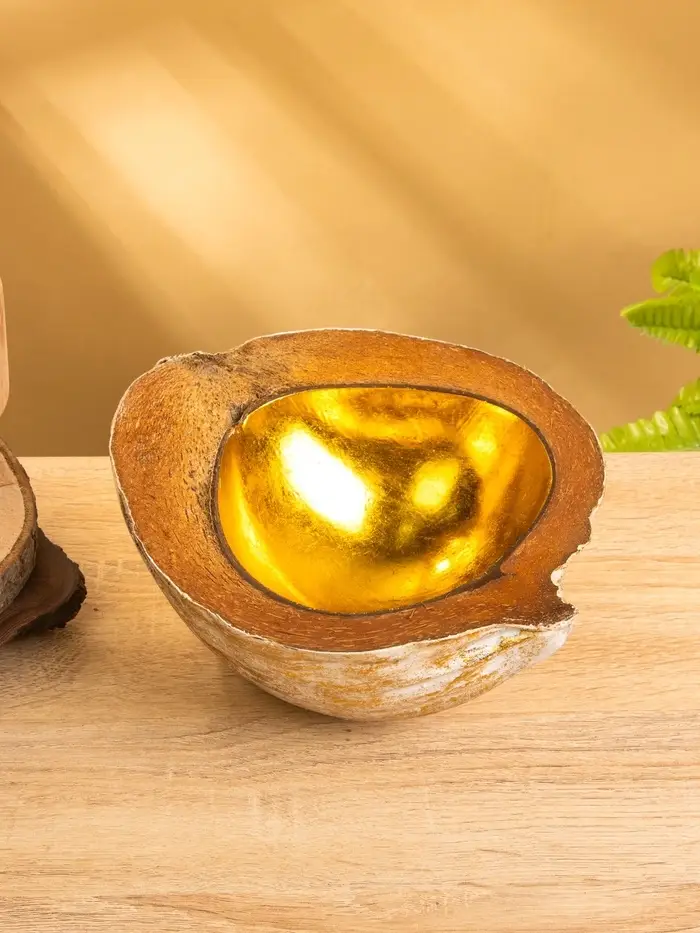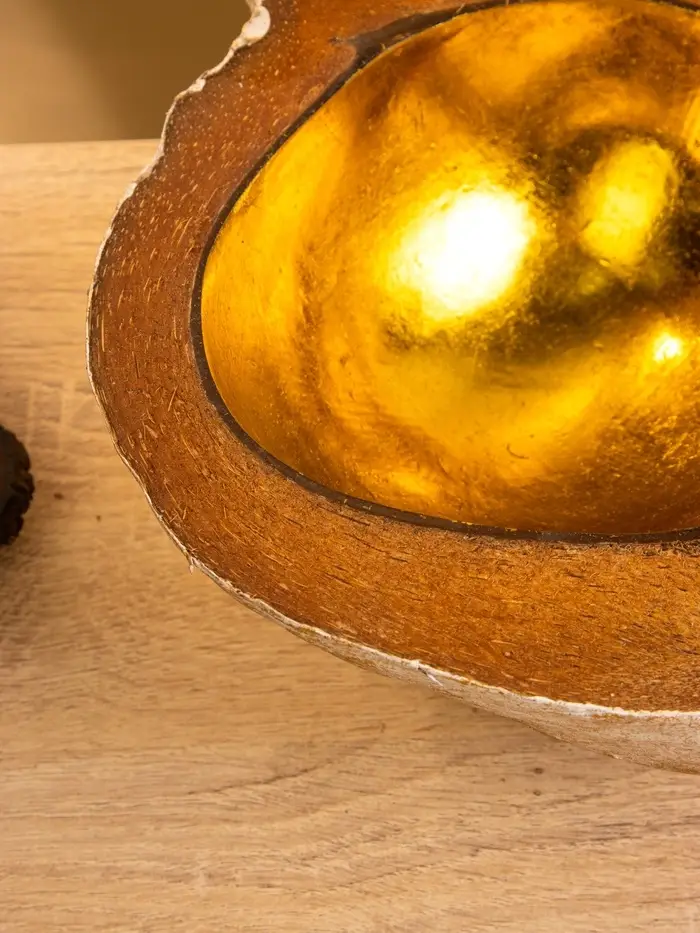 Чаша из кокоса — изысканное изделие ручной работы в нежной бежево-золотой гамме. Изготовлена из цельного кокоса с сохранением естественного рельефа скорлупы. Фигурная форма и благородное золотое покрытие придают особый шарм. Не подходит для СВЧ и посудомоечной машины.