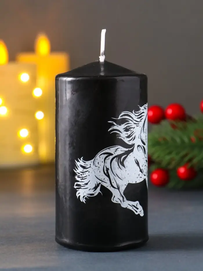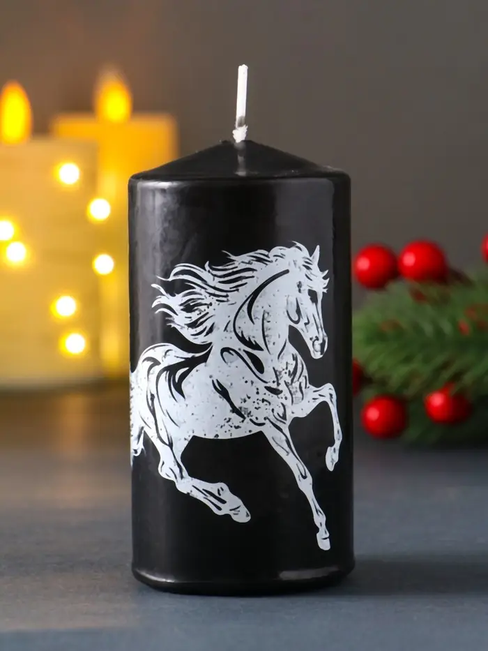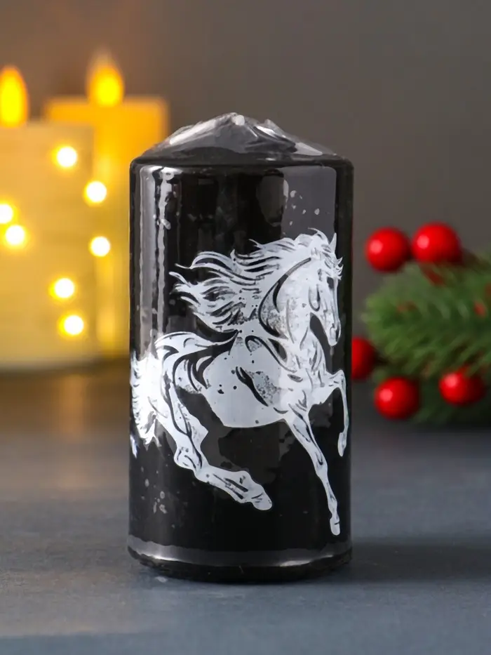 Свеча столб 50*100 мм с накаткой "Символ года" , Конь, черная