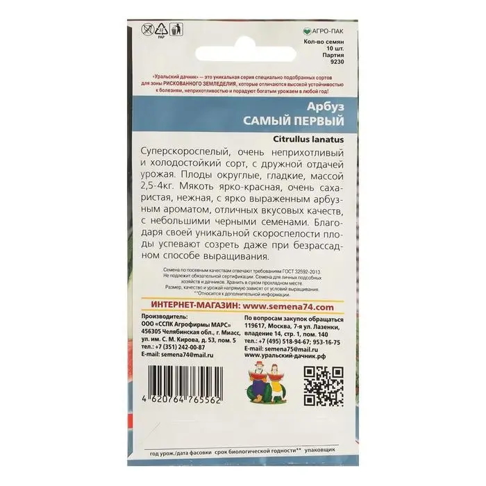 Семена Арбуз "Самый Первый", ультраскороспелый, 3-4 кг, 10 шт.