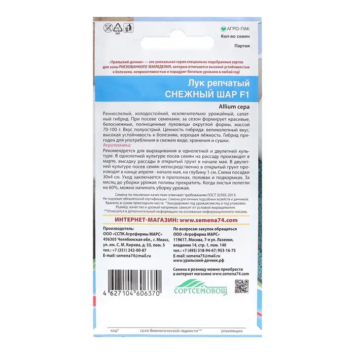 Раннеспелый, холодостойкий, исключительно урожайный, салатный гибрид. При посеве семенами, за сезон формирует красивые, белоснежные, полноценные луковицы округлой формы, массой 70-100 гр. Вкус полуострый. Ценность гибрида: великолепный вкус, высокая устойчивость к болезням, хорошая лёжкость. Гибрид пригоден для употребления в свежем виде, хранения и сушки. Рекомендуется для выращивания в однолетней и двулетней культуре. В однолетней культуре посев семян на рассаду производят в марте, высадку рассады в открытый грунт в начале мая. В двулетней культуре посев семян непосредственно в открытый грунт производят в конце апреля - начале мая, на глубину 1 см. Схема посадки 30х4 см. Уход заключается в прополках, поливах и подкормках. За месяц до уборки урожая поливы прекратить. Когда листья полегли на 60%, можно начинать уборку урожая.